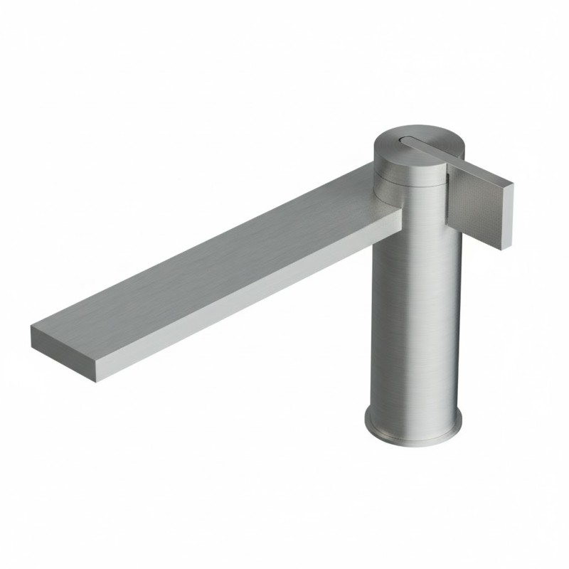 "Un point fixe" qui vient croiser les lignes nettes et orthogonales du corps du mitigeur, sculptées dans le noble acier AISI 316L. Des géométries pures, rigoureuses et rationnelles alternent avec des volumes ronds et doux, créant un jeu efficace d'emboîtements.