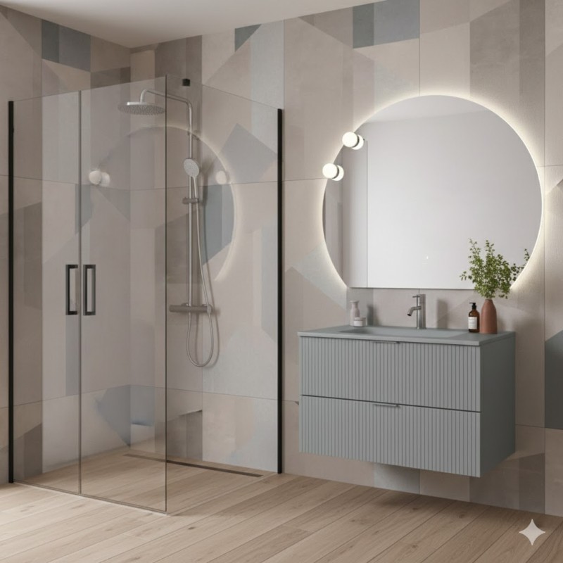LINE COMPOSITION MEUBLE 100 CM AVEC LAVABO EN VERRE SATINÉ GRIS MAT AVEC MIROIR ROND